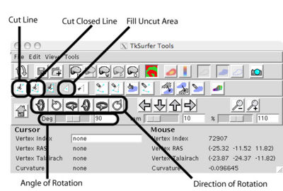 The important buttons on the TkSurfer window are shown below: