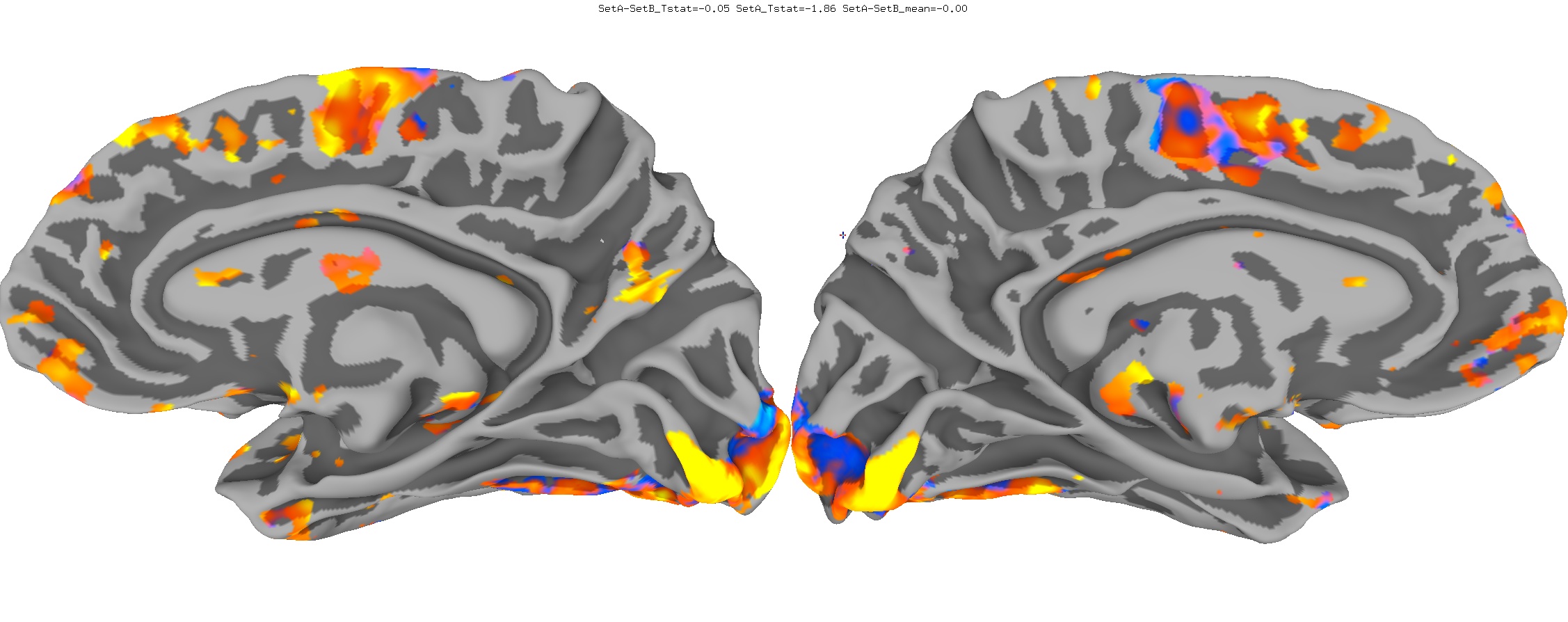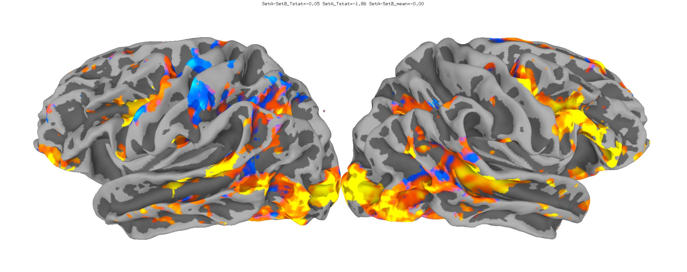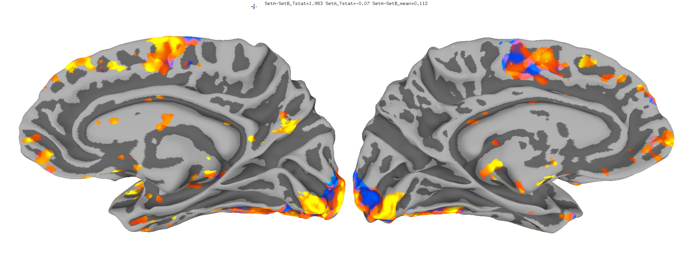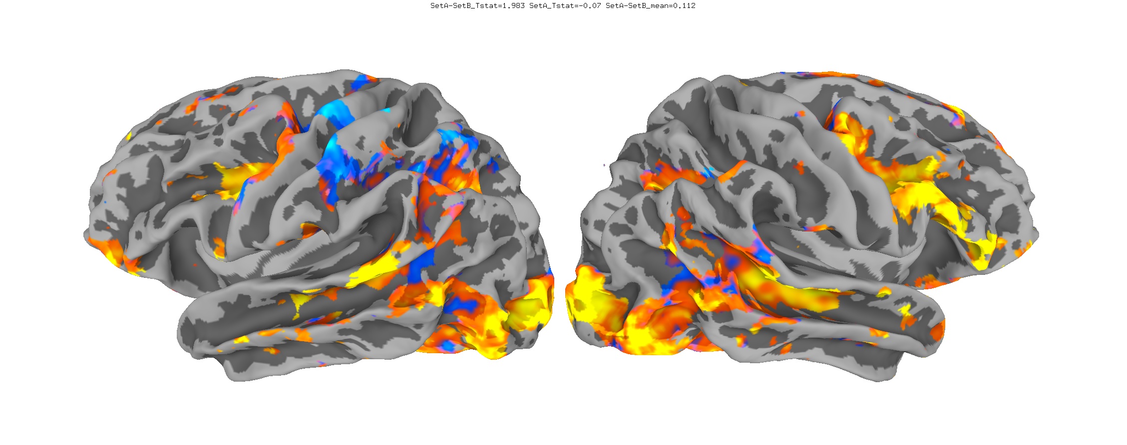Functional data of the Mouth vs. Eye contrast mapped to the average surface. It is hard to quantify the difference, but one way is to compare the maximum statistical values; with better intersubject alignment, these would presumably increase.