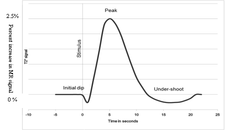 - Shortly after this initial dip, the signal rapidly begins to rise due to the supply of more and more oxygenated blood. There is more supply of oxygenated blood than is necessary and this gives an increased MR signal till the end of the stimulus. A few seconds after the end of the stimulus the signal rapidly decreases to end, via a post-stimulus undershoot, at its normal level.