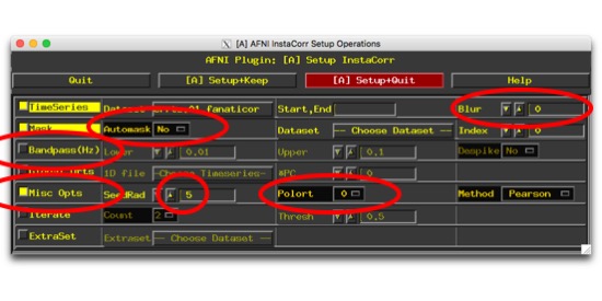Set up the other options. We’ve already processed these data, so there’s no need to do more. – No need to blur. (Unless you didn’t blur because you’re going to sample to the surface next, then set this to be ~1.5 times your voxel size). – I don’t like to mask at this stage, because I’d like to see if there’s weird stuff happening outside the brain. – No need to bandpass – But, we do want to have a seed that’s bigger than a single voxel. So, check “Misc Opts,” and bump up the radius to something larger, maybe 5. You can also turn off the polort step (we did that already in the processing.)