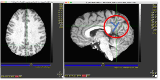 Now, we’re going to start by finding the DMN. It’s one of the most robust resting state networks, so if you can’t find it in your processed data, there’s a good chance something has gone horribly, horribly wrong. I find this by choosing a sagittal slice just off the midline (in about the center of that line of grey matter), and finding where the two marked sulci intersect. They have names, I don’t remember what they are. But, it’s a wiki page, so someone could add them. ctrl-shift-click.