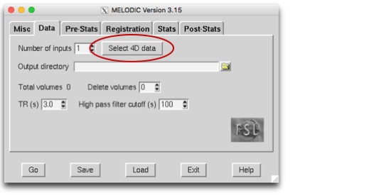 In the Melodic window, select “Select 4D data” and navigate to tall.$sid.nii. Once you’ve selected your data, it will automatically detect the TR and the number of volumes. Make sure that looks right. Now, we’ll move on to the next tab, which is “Pre-Stats”.