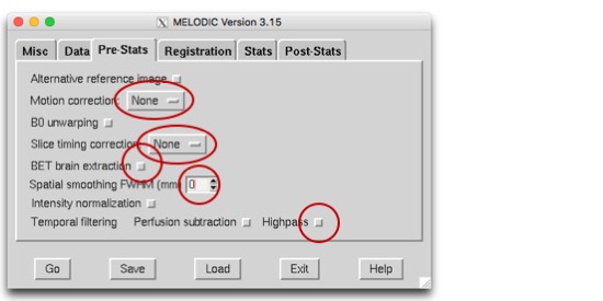 We’ve already processed this, so now we’re just going to tell Melodic a big ‘ol Thanks, but No Thanks. So, we’re setting motion correction to “None,” Slice timing correction to “None,” BET brain extraction (masking) to “None,” Smoothing to “0,” and turning off Highpass filtering. (I know, I know. If we were just going to turn BET off, why’d we bother with the mask thing, right? Well, it’s still going to find the brain bits, it’s just not going to use BET to do it… or, more accurately, I believe it’s still going to set all the nearly-zero voxels to be zero.)