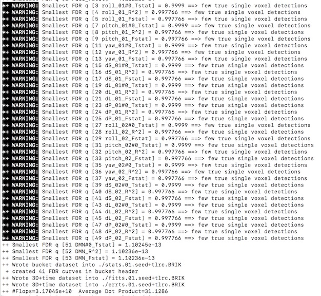 These are good. What they mean is that there are no voxels that are significantly fit by the noise regressors you’ve included. That’s good because you already regressed them out. They’re only there so that 3dDeconvolve knows how many degrees of freedom you really have. Note that you don’t get the same warning for your seed regression, because that’s new variation.