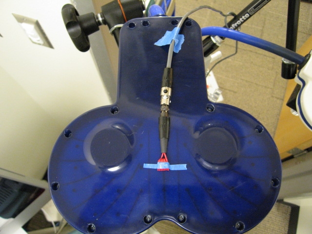 The TMS coil is too small to fit in the standard SENSE head coil. The two options are to use the 2-element surface coil (TMJ coil) for local coverage or the whole-head birdcage transmit/receive (TR) coil. If using the TR coil, the placement of the TMS coil relative to the TR coil is critical. If it is too close to the bars of the TR coil, the scanner will give an error message such as: “TR head coil requires 2149 watts. Limit is 2000 watts.” This might be due to inductive coupling between the headcoil and the TMS coil, so the scanner cannot drive the coil to generate RF.