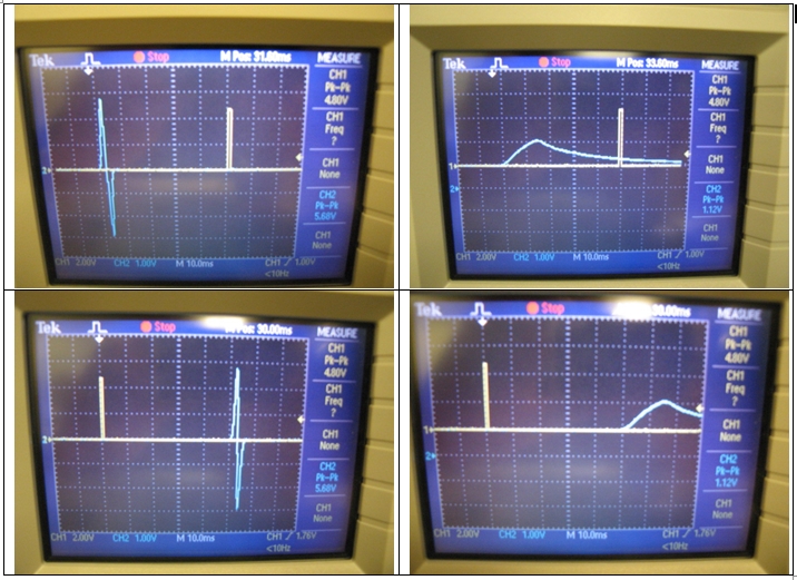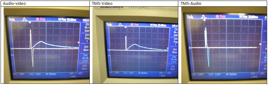 So far all these timings were related to the “input side”. To measure the actual time (the time the illumination of the appropriate pixels change) I attached a photo diode to the LCD monitor at a location where a small white dot would be displayed using Presentation and connected it to the oscilloscope. The audio (from computer audio jack) and TMS (from the NIDAQ) were directly connected to the oscilloscope.