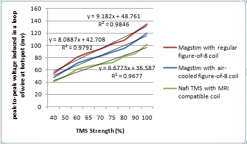 - Magstim with regular figure-of-eight coil is ~35% stronger than Nafi's TMS with MRI compatible coil