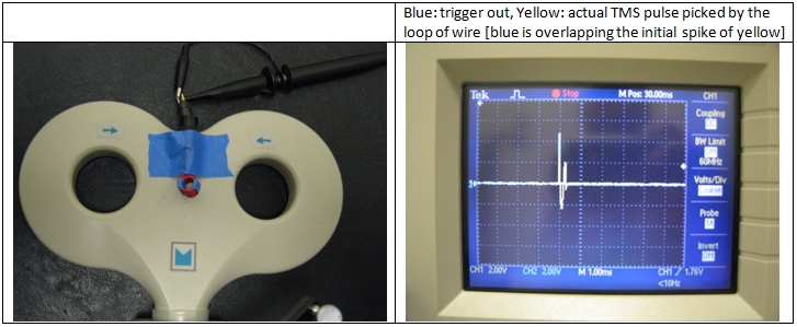 Another source of potential delay could be the TMS machine itself and the audio amplifier. I tested the input-output delays of our Magstim Rapid and PylePro PCA1 amplifier and they were negligible. I used the trigger-out of TMS machine for this test. To rule out the possibility of any delay between this trigger-out signal and the actual TMS pulse at the coil, I attached a loop of wire to the hotspot of TMS coil and connected it to the oscilloscope. There were no delays between the trigger-out signal and the actual TMS-pulse: