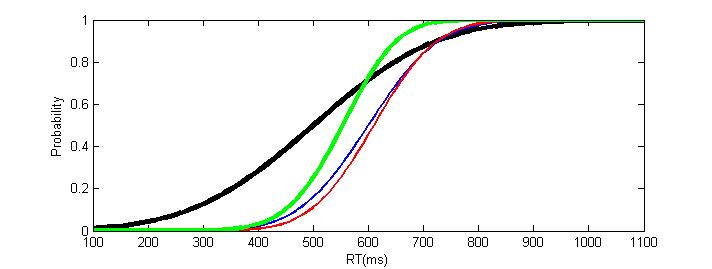 where red and blue lines show the distribution of RTs for unisensory trials. Green shows what would be expected for multisensory trials from the race model. Black shows what was actually seen in multisensory trials which for RTs less than ~575ms is better than the race model, showing the advantage of multisensory integration. (data is made up for illustration purposes)