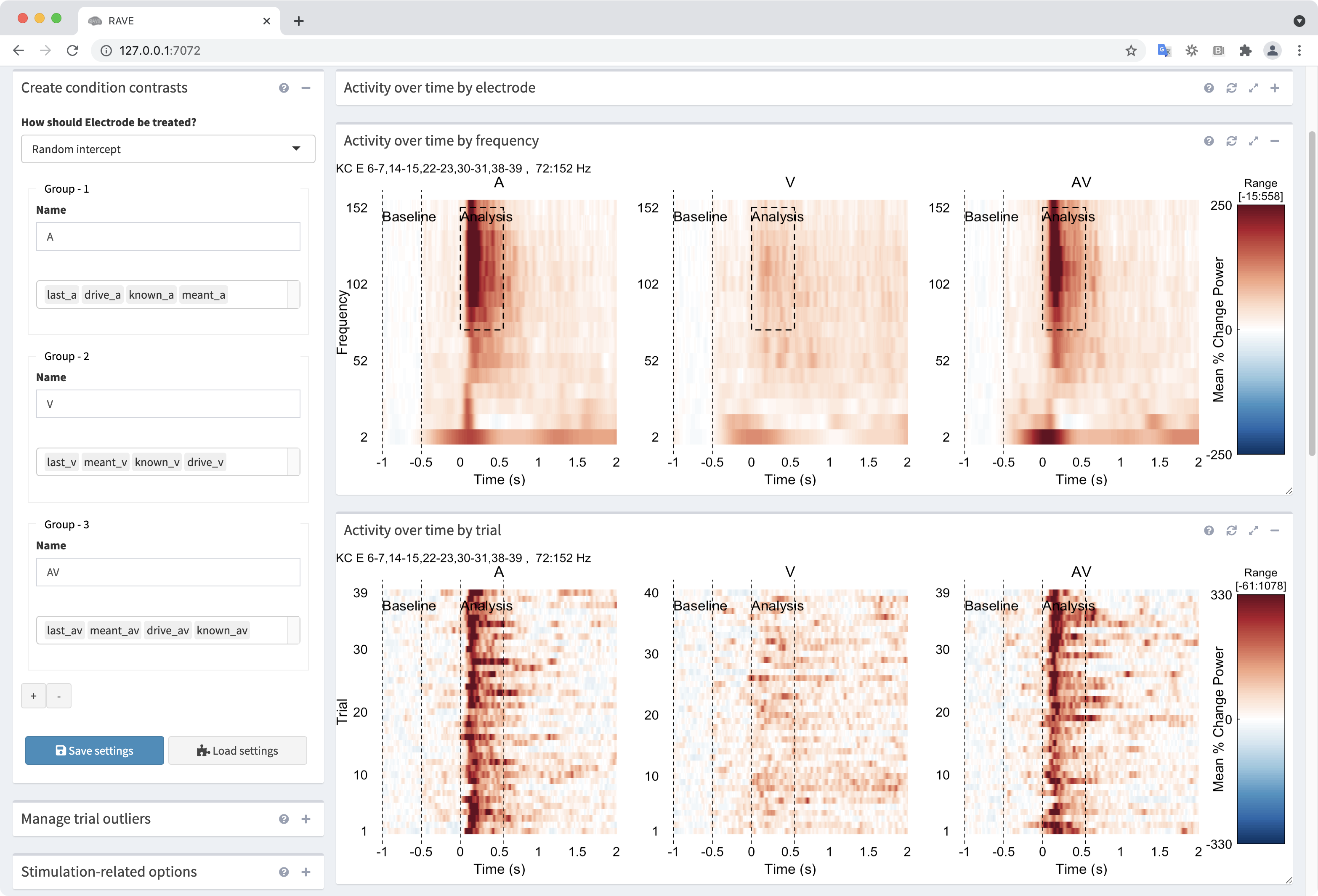 If you need to run an analysis on your data that RAVE doesn’t (yet!) support, you can export your baseline-corrected, frequency-collapsed data for use in other code. If you want to use the raw data (e.g., if you pre-processed your data in RAVE), you can load the .h5 files directly from the RAVE data directory.