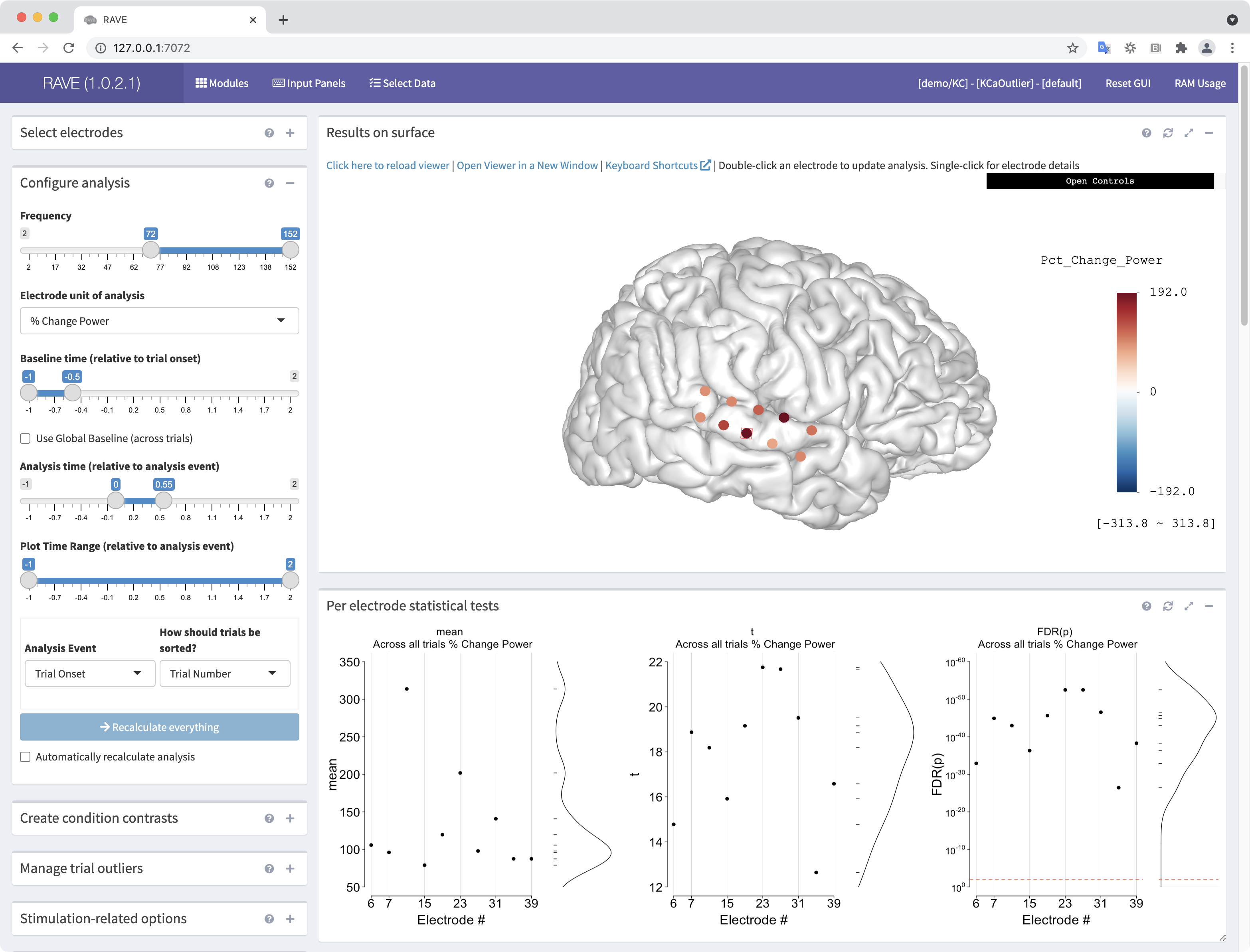 - Choose “Functional filters” like FDR-corrected p-values, t-scores, and mean signal. Active filters show up as red dashed lines on the “Per electrode statistical tests” graph.